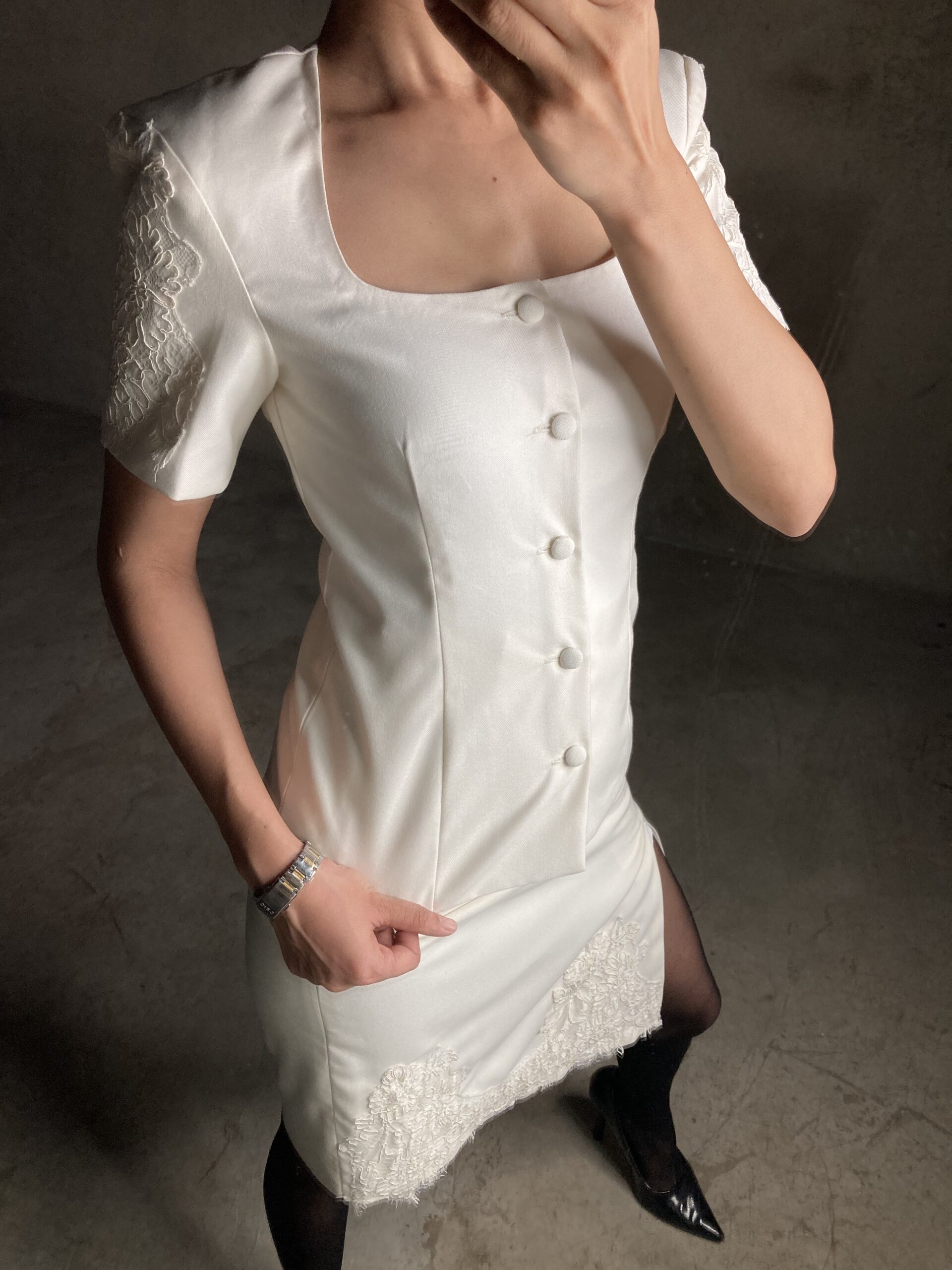This Coconut Shoulder-Pad Shirt, made from structured suiting fabric with soft lining, shapes you with quiet strength and elegance. Shoulder-padded sleeves with delicate lace patch detailing, a refined neckline, and button-up finish create a powerful yet feminine feel, worn here in Size 4. With a 24” length and 10” sleeves, it moves with you polished, confident, and effortlessly statement-making.