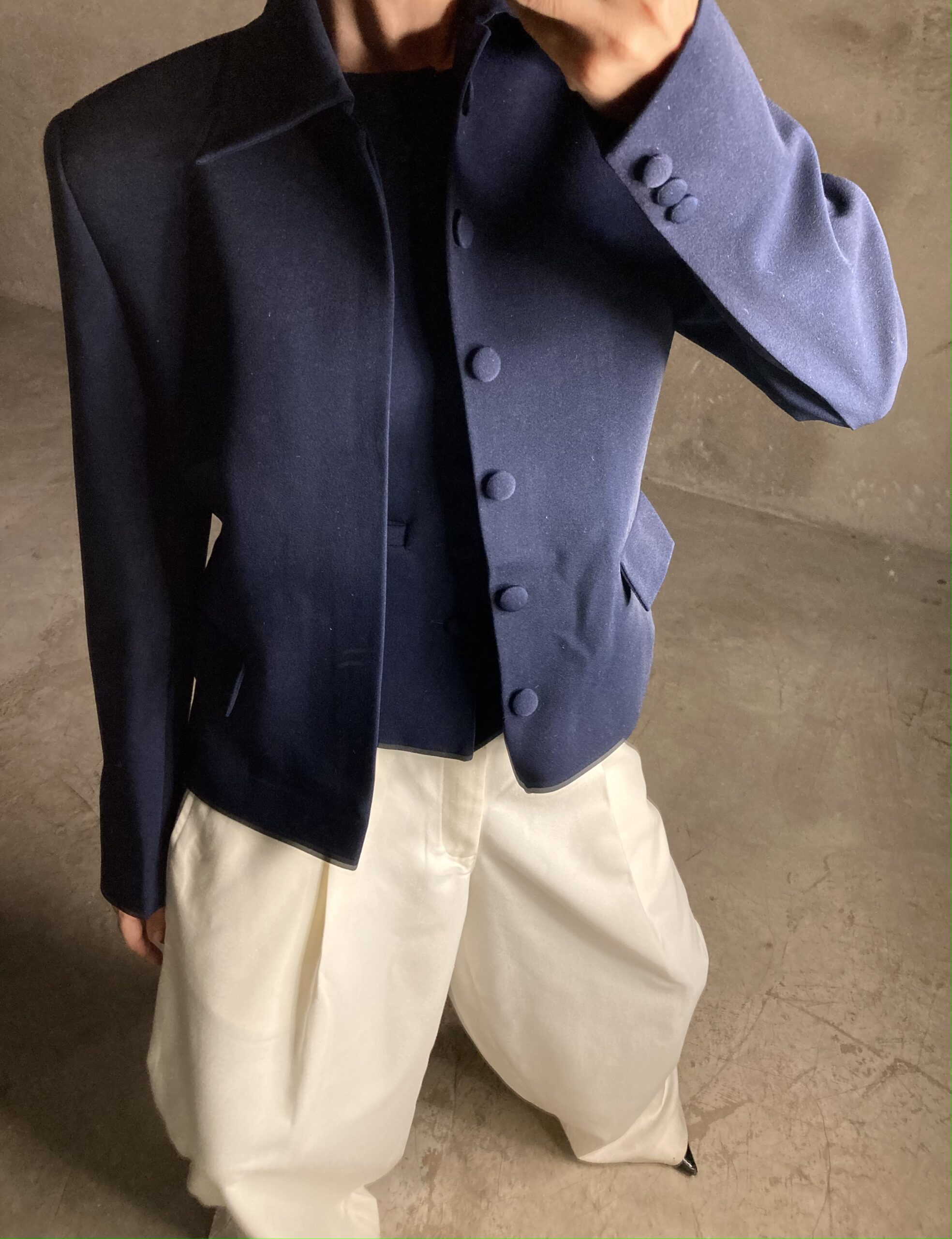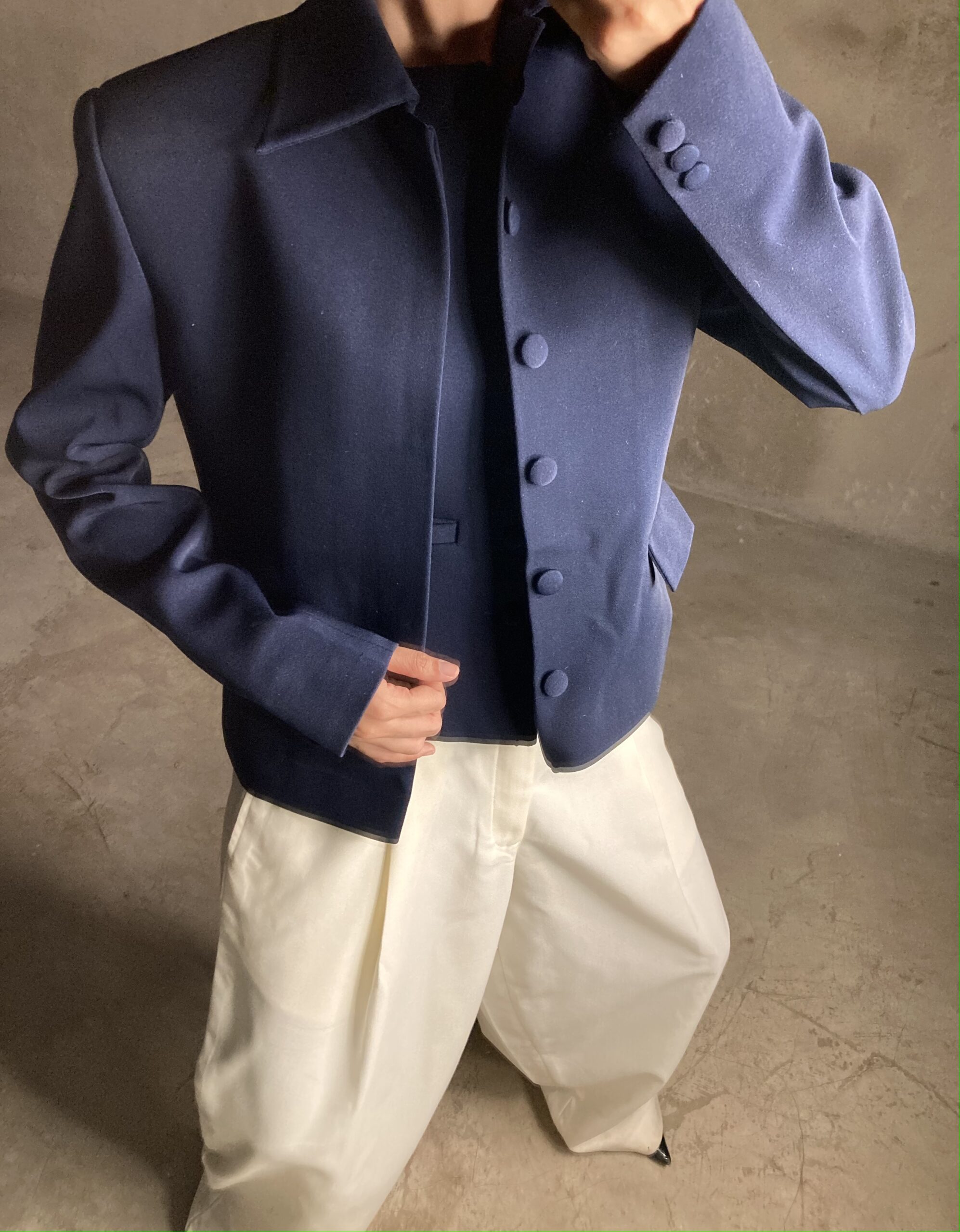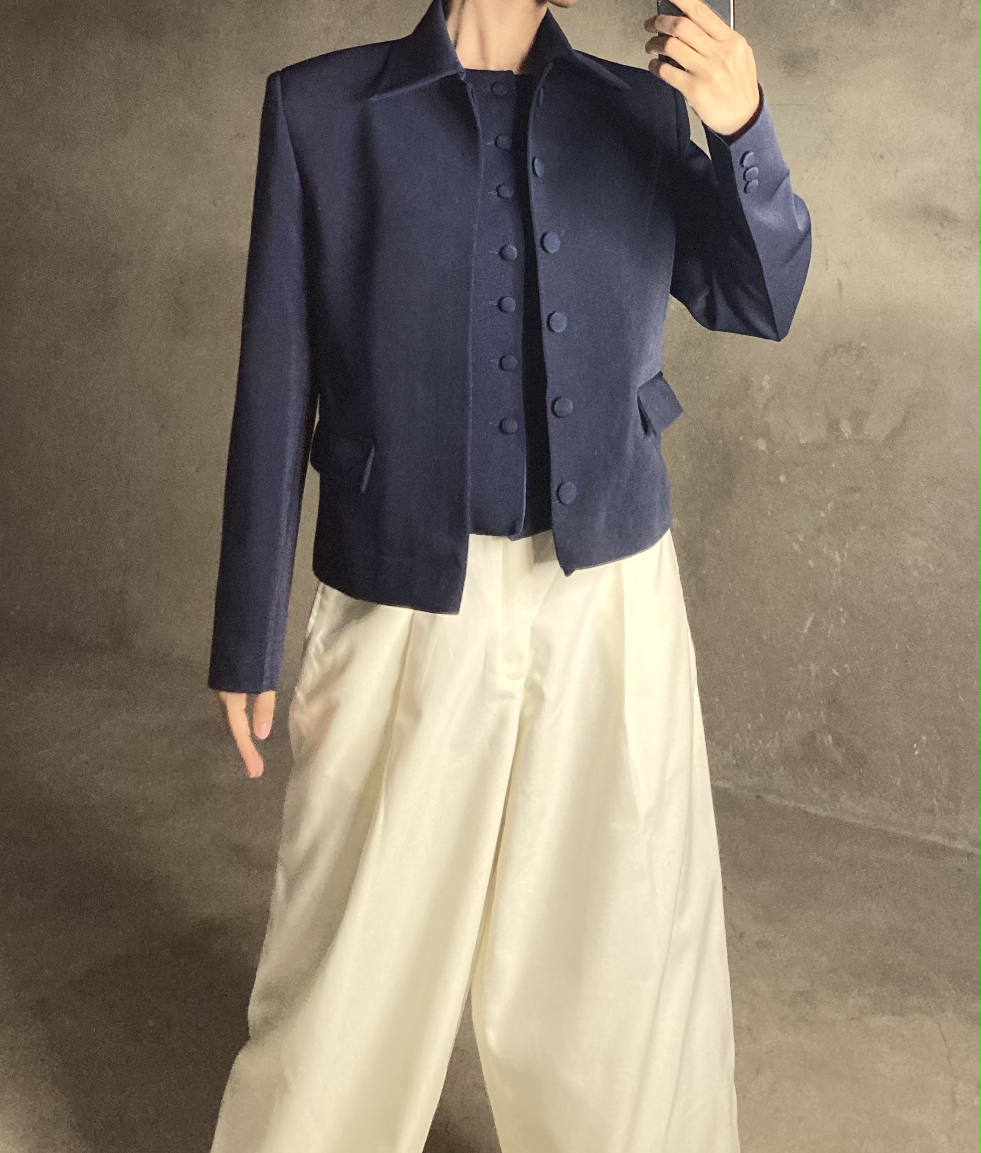This navy blazer is tailored in imported high-end polyester with a sharp collar and matching front buttons that feel instantly powerful, length 20”. Worn here in Size 32 for a Bust 31, it hugs just right, letting you choose fitted confidence or relaxed ease by sizing up. It’s that timeless layer that makes every outfit feel finished the moment you slip it on.
