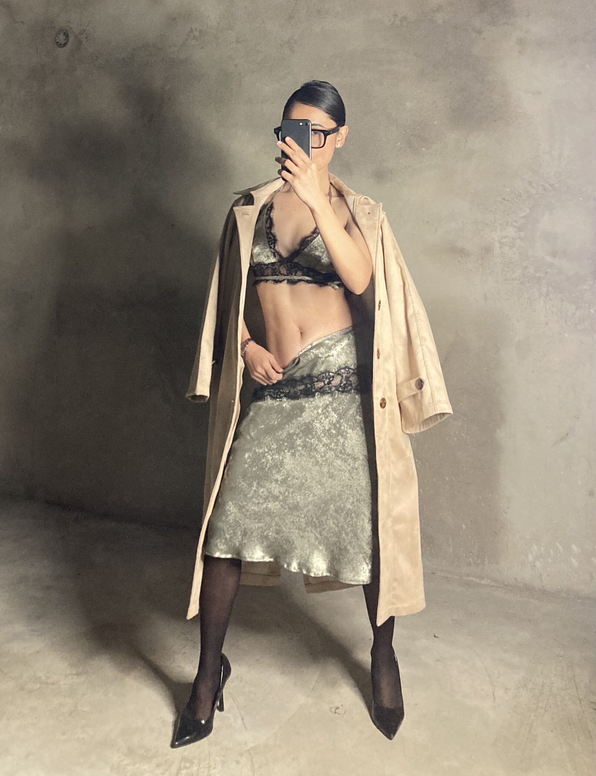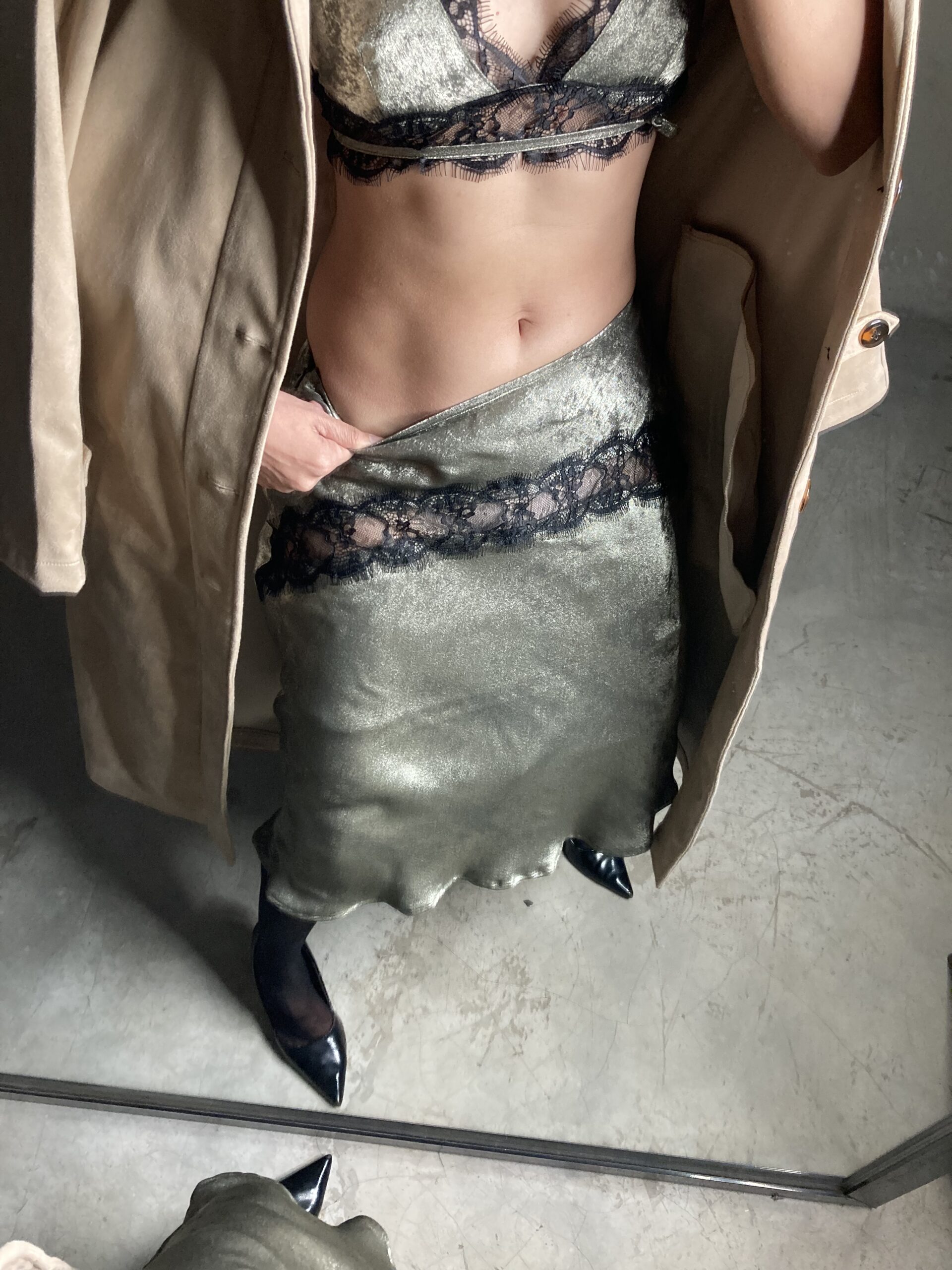 Olive aura shimmer skirt crafted in a lightweight, flowy fabric that glows softly without being loud. Designed with subtle lace detailing and a beautifully balanced silhouette that makes a quiet statement. Tailored at 22 inches in length for a versatile fit; model wears size 64 (waist 26).