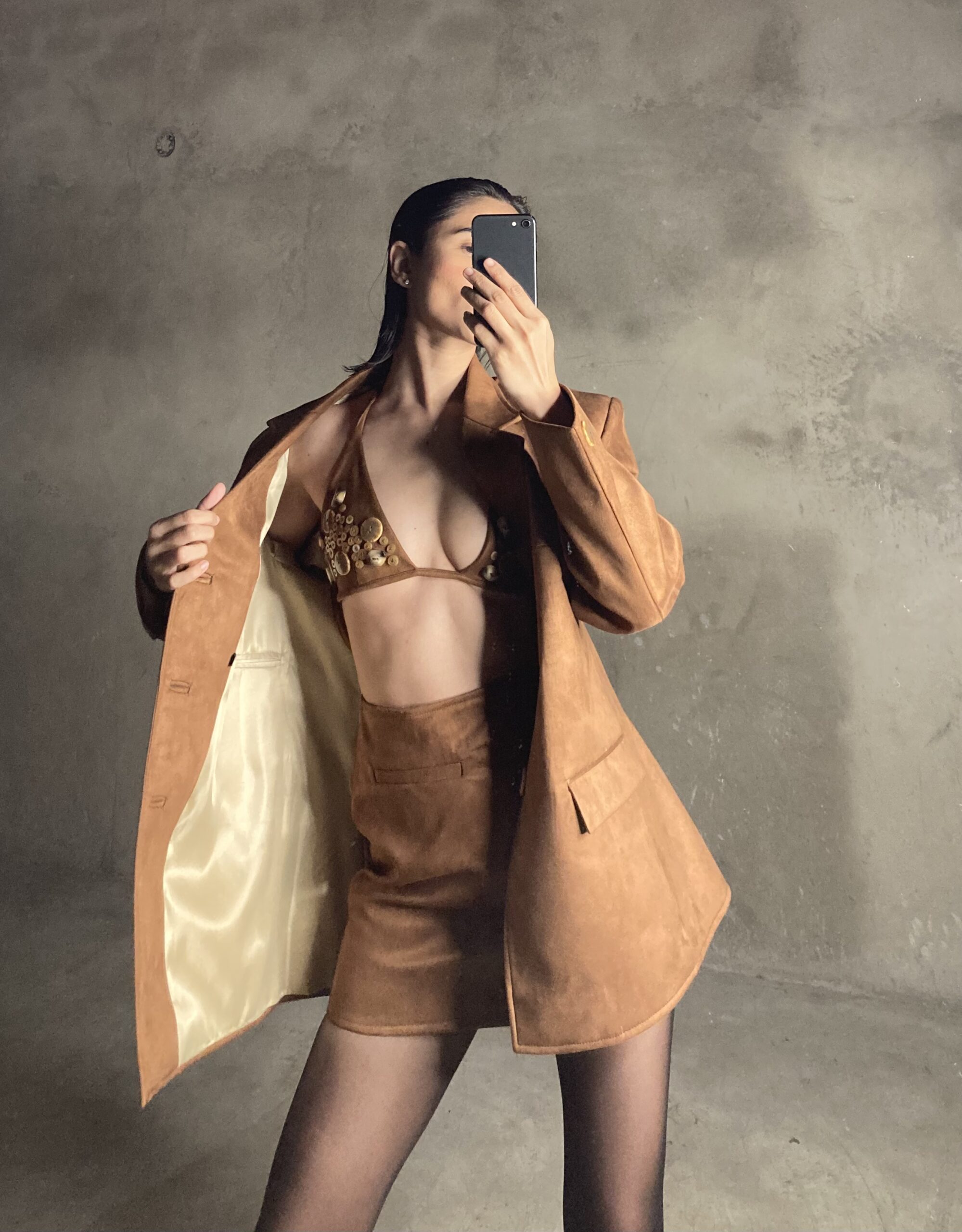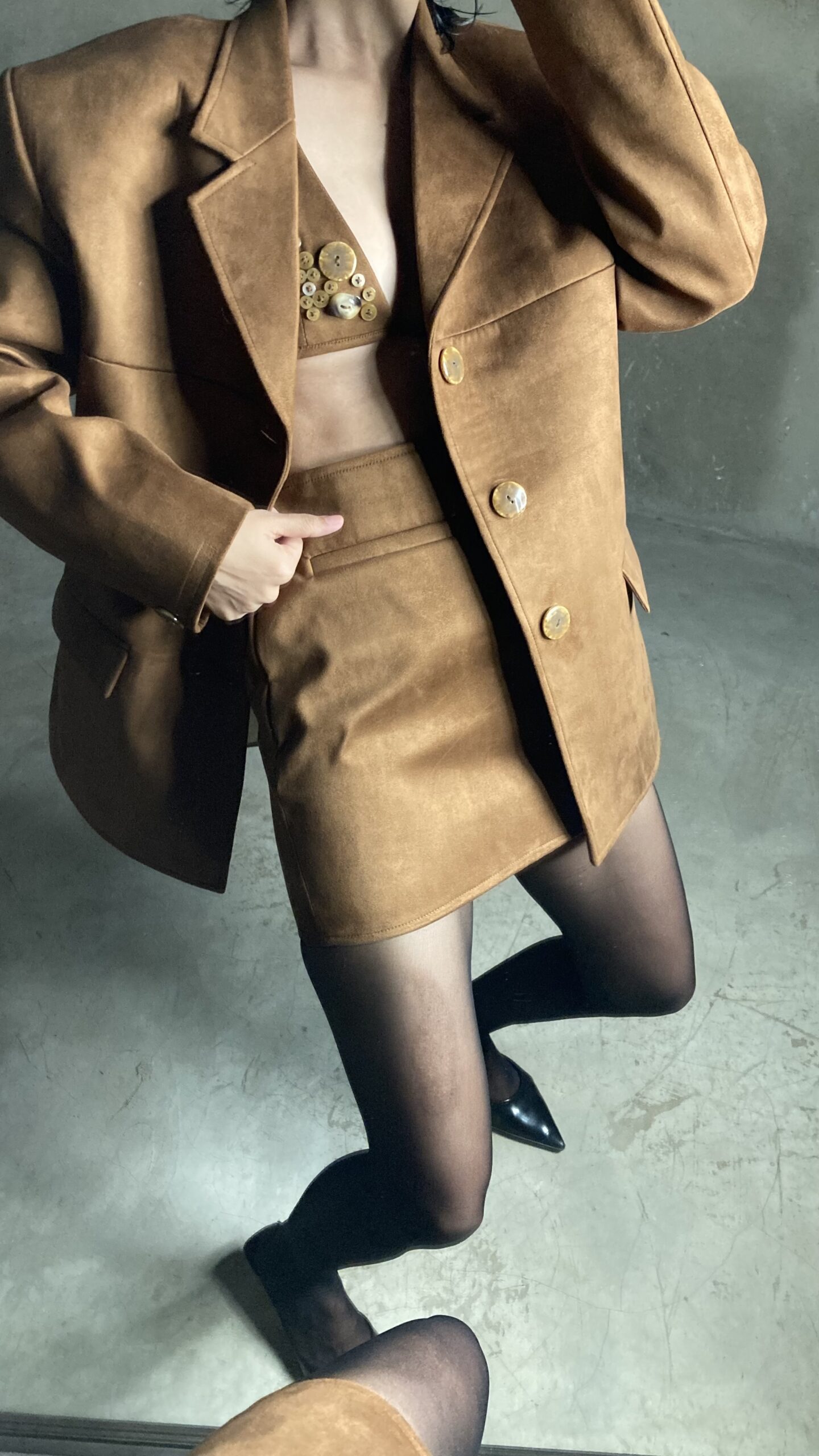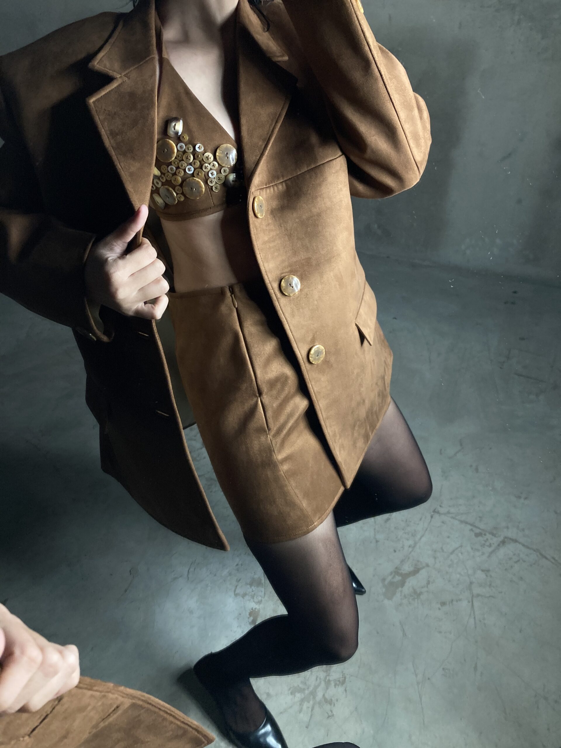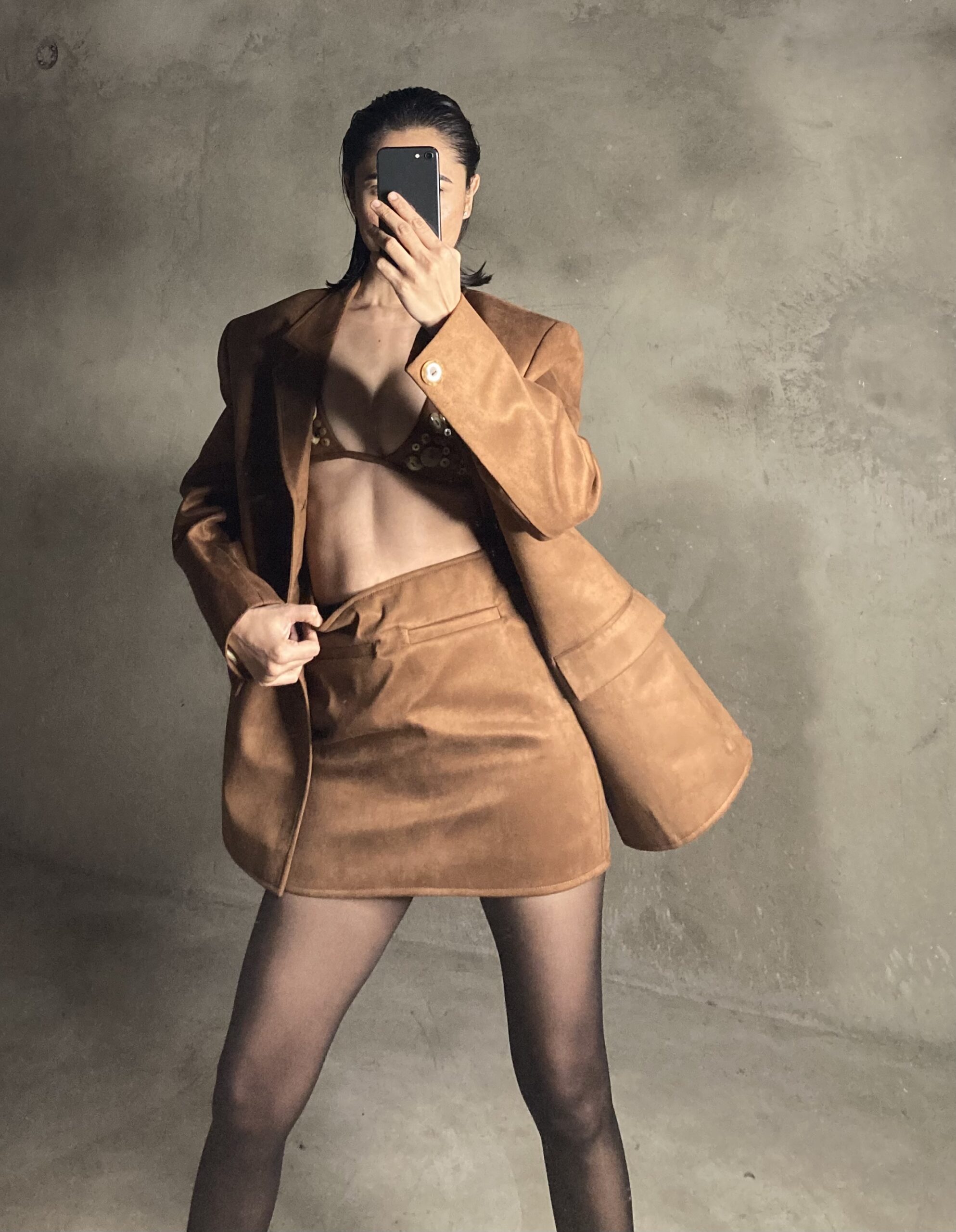 A rust brown mini skirt crafted in premium suede fabric with a matte, luxurious finish. Designed at a 15” length, it features two functional front pockets, one back pocket, and a seamless side invisible zipper for a clean look. Chic, classy, and high-quality, a true fall-winter staple. Model wears size 6 for waist 26. Pair it with the matching blazer or style it with tanks, knits to oversized shirts for an elevated everyday look.