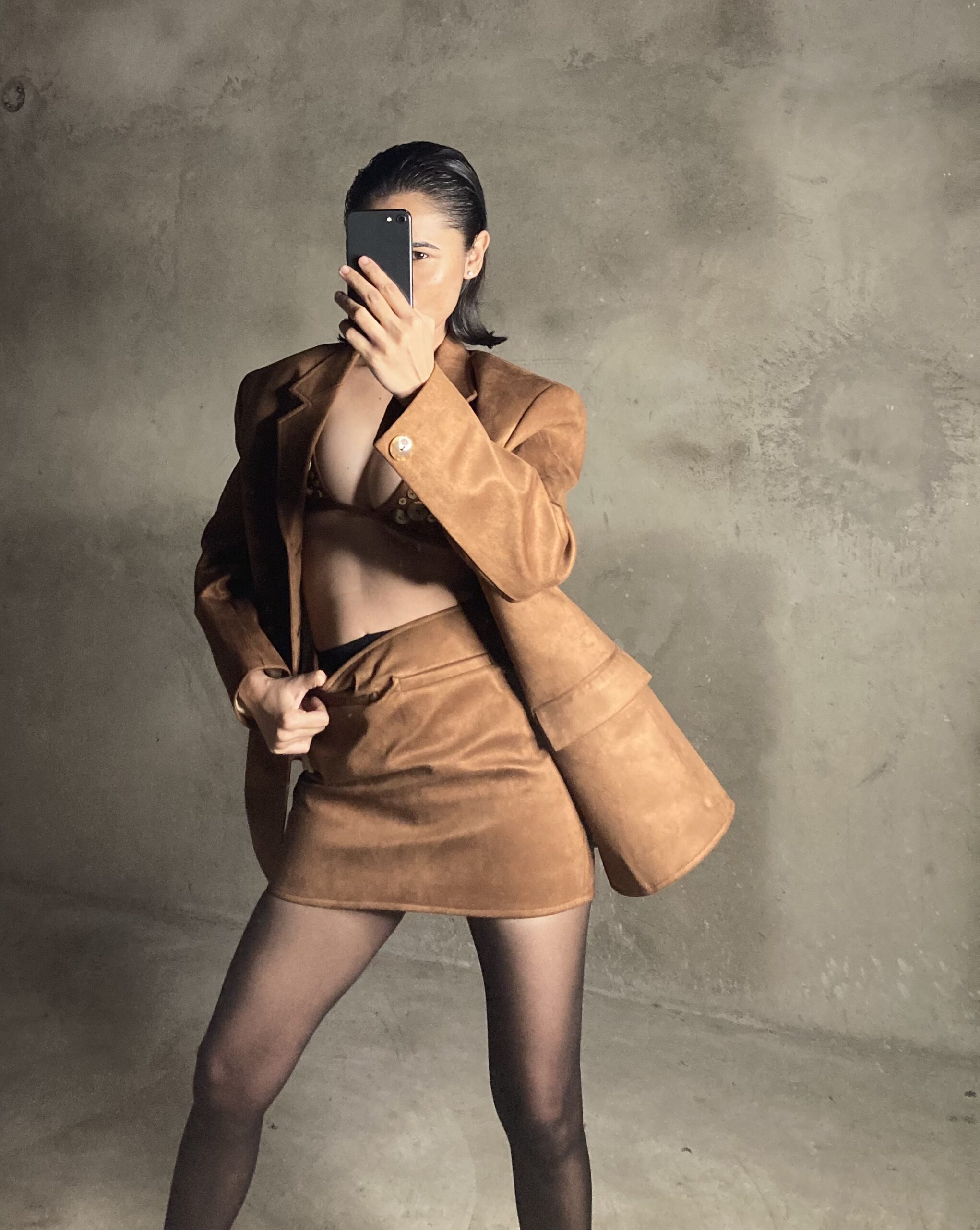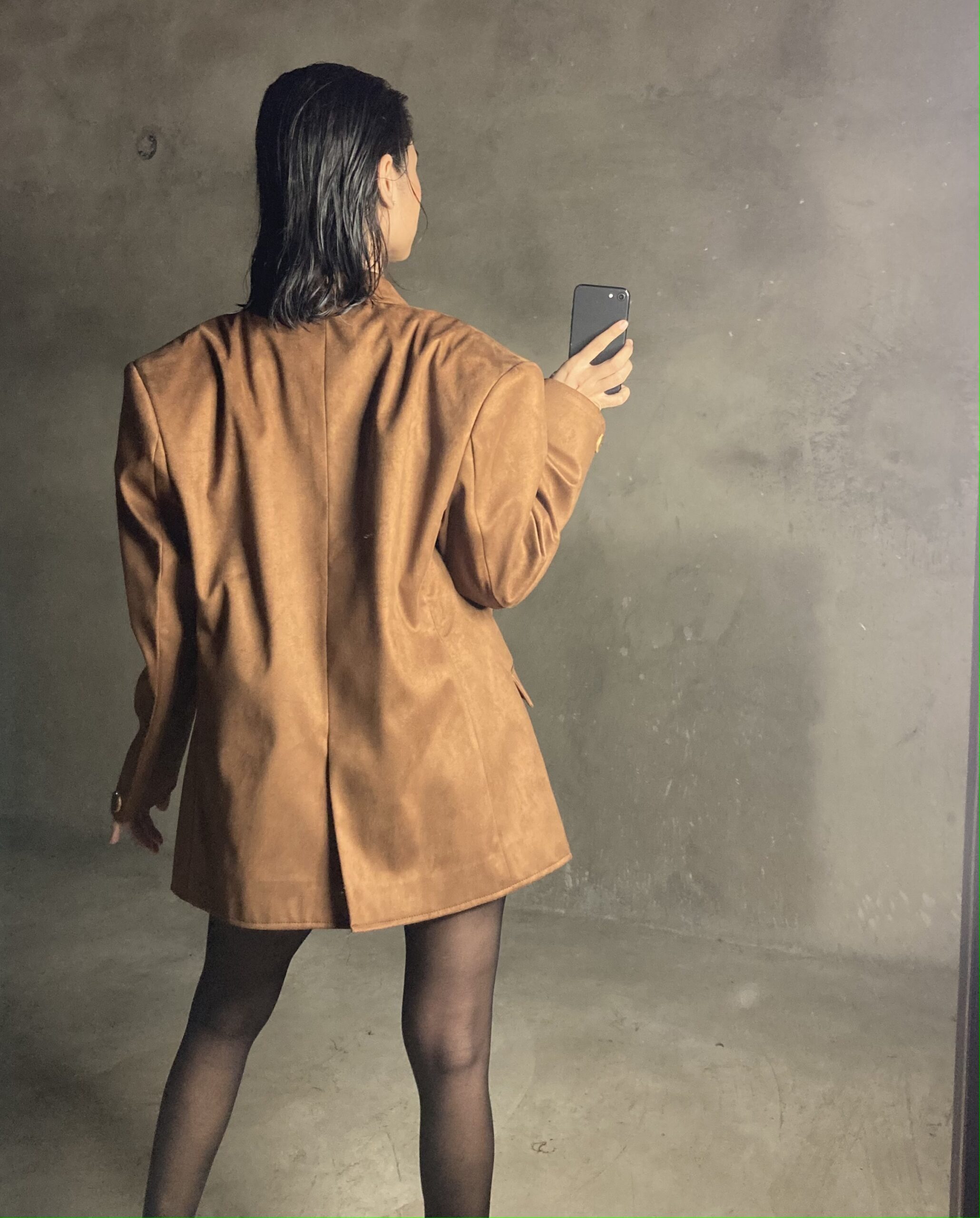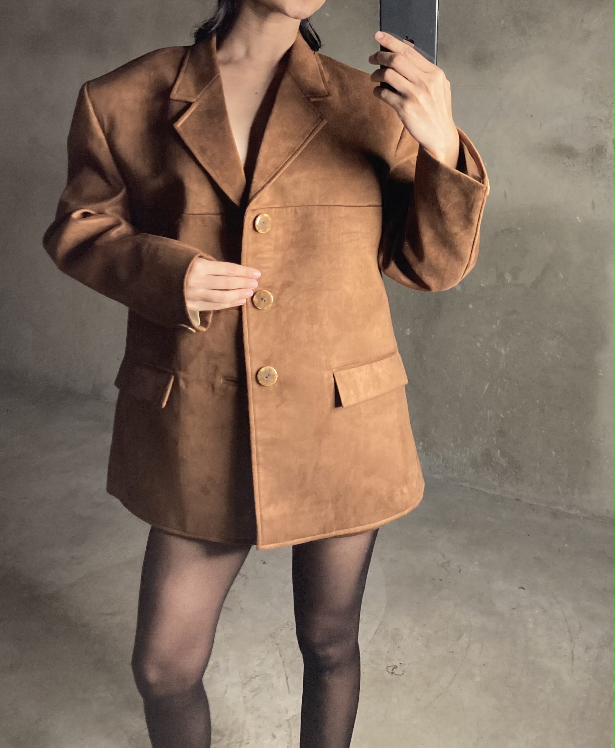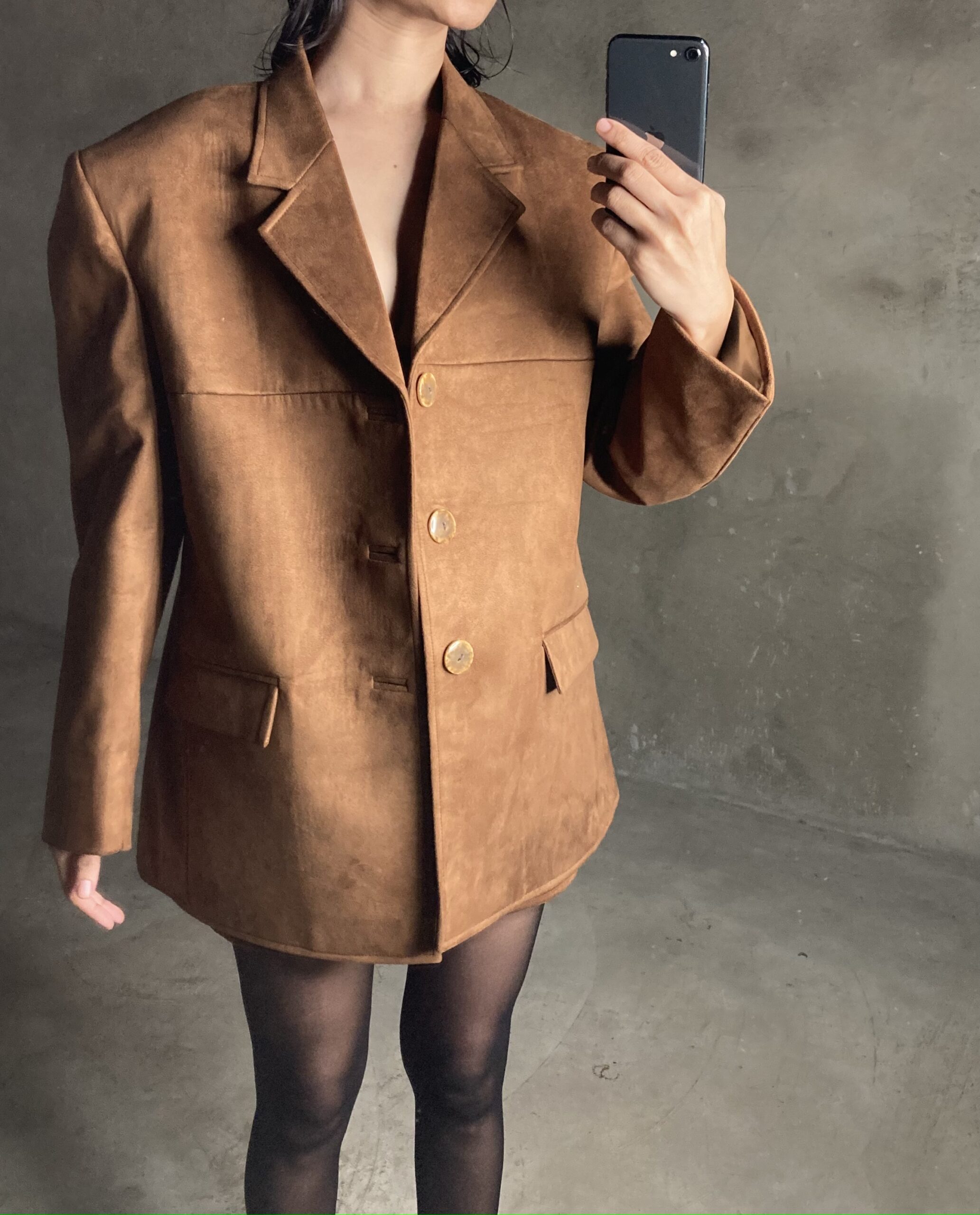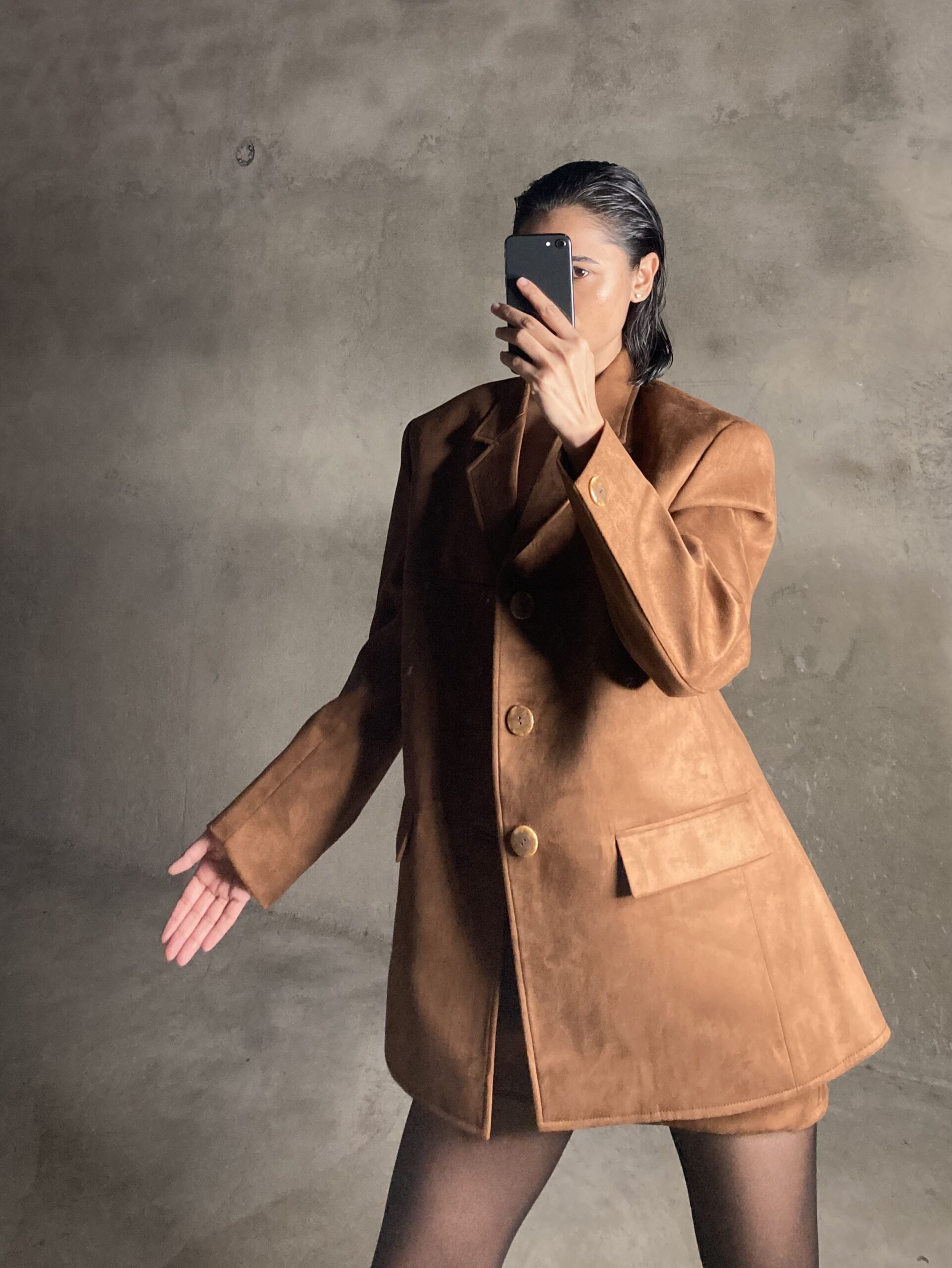 Rust brown oversized blazer crafted in premium luxe suede, designed for a chic, relaxed silhouette with a front button. Length: 29 inches, finished with two side pockets for a refined yet effortless appeal; model wears size 38 (bust 32) for an intentionally oversized fit. A versatile power piece, wear it solo or paired with matching skirt available individually, perfect for everything from date nights to formals.
