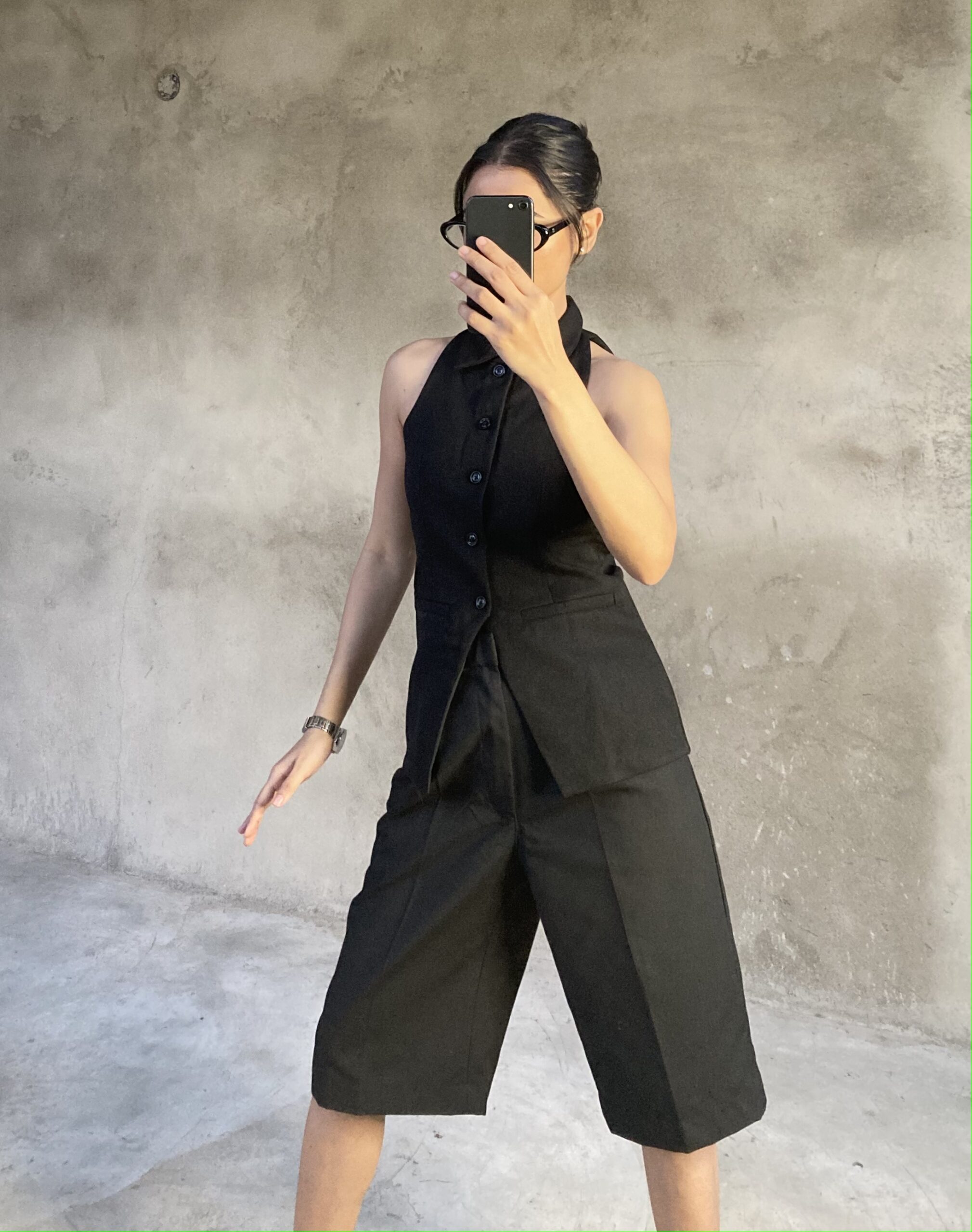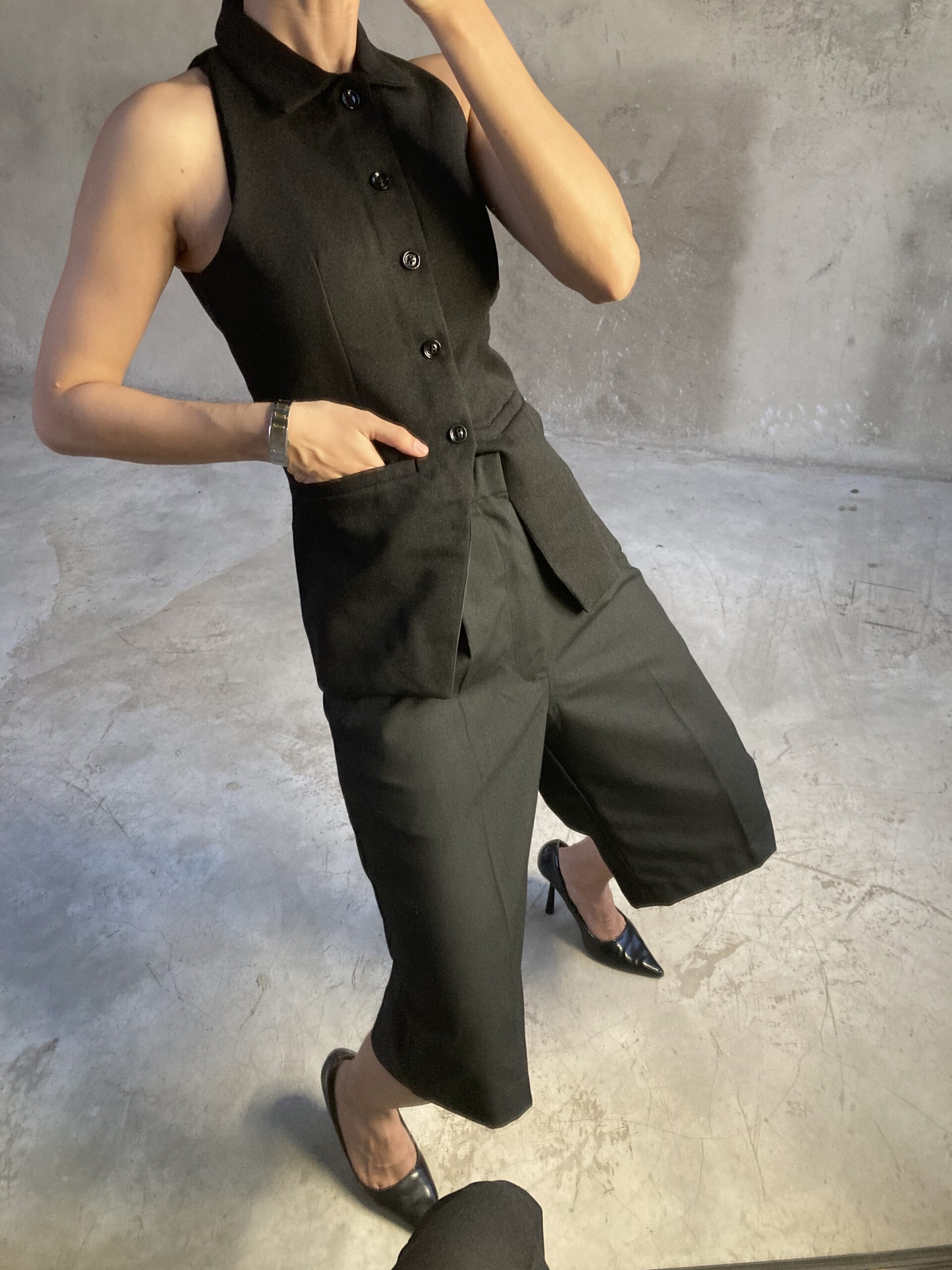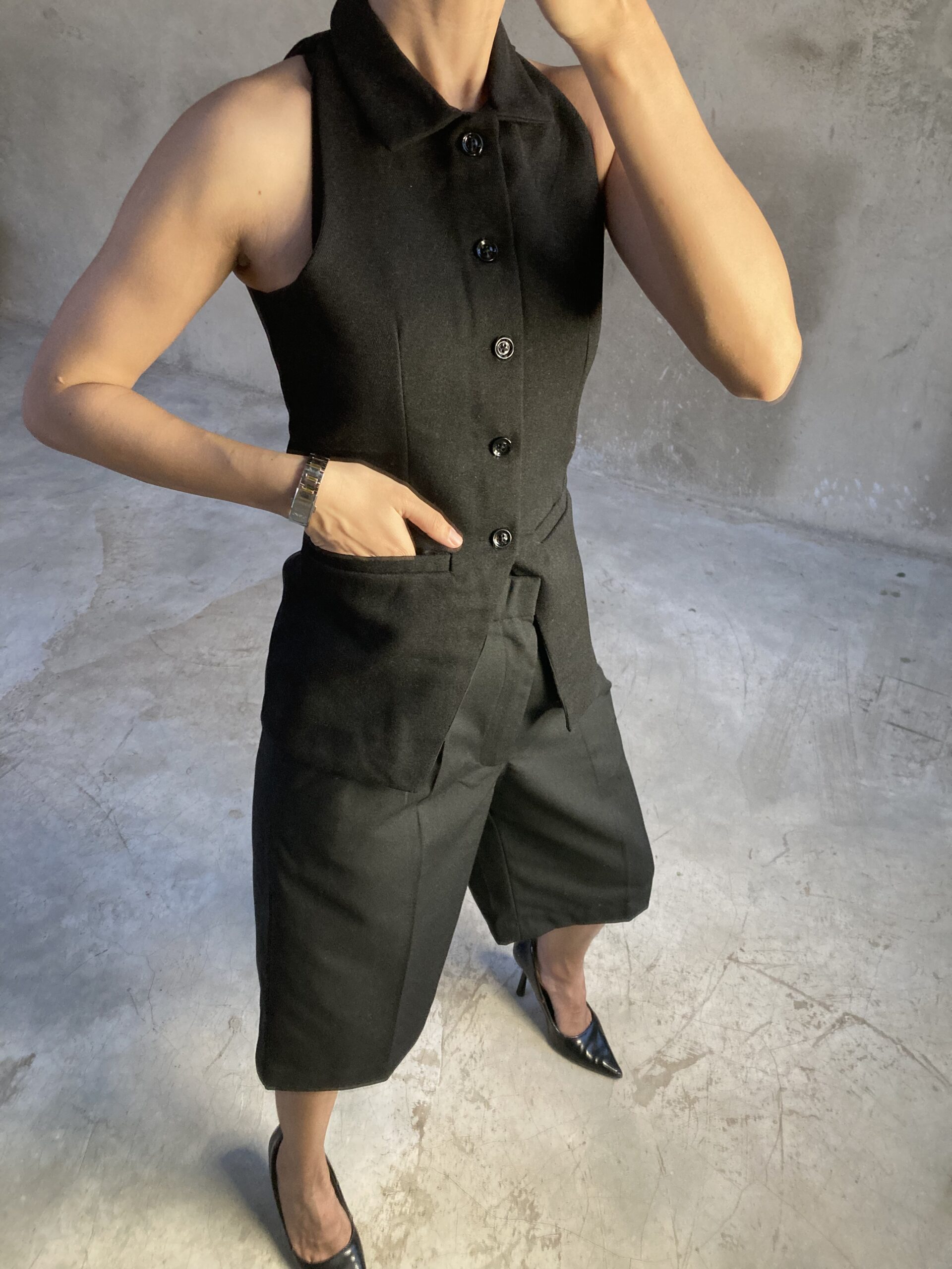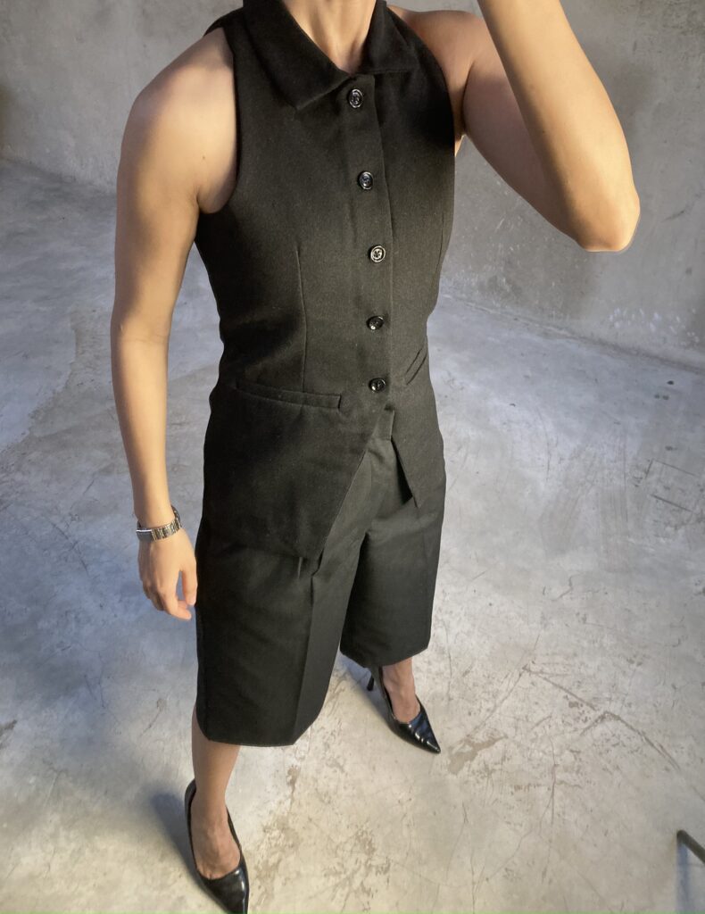 Black tweed waistcoat with a sharp collar, two front pockets, refined button-up detailing and a back buckle for structure, crafted to be the perfect work-to-dinner essential with a naturally well-fitted silhouette; model is wearing size 4 for bust 30.